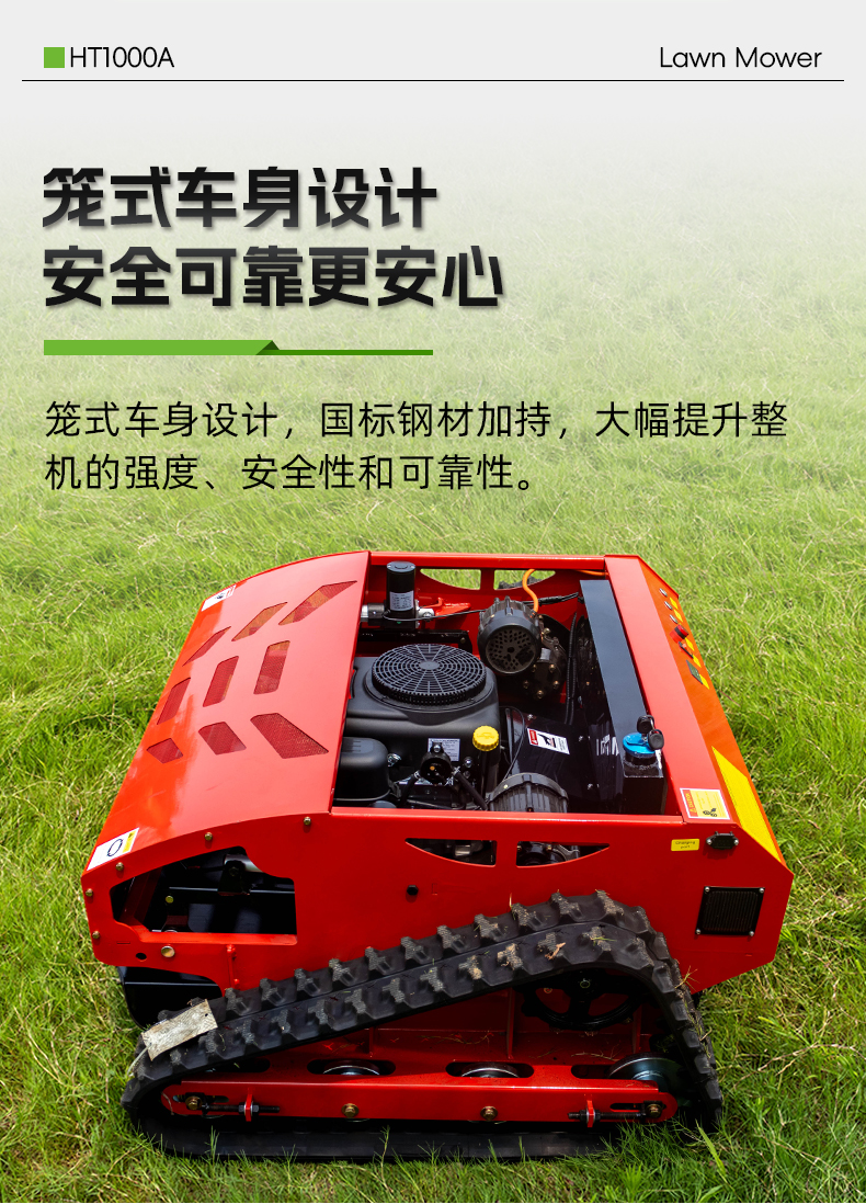 HT1000A遙控割草機(jī)籠式車身設(shè)計,國標(biāo)鋼材加持,大幅提升整機(jī)的強(qiáng)度、安全性和可靠性。
