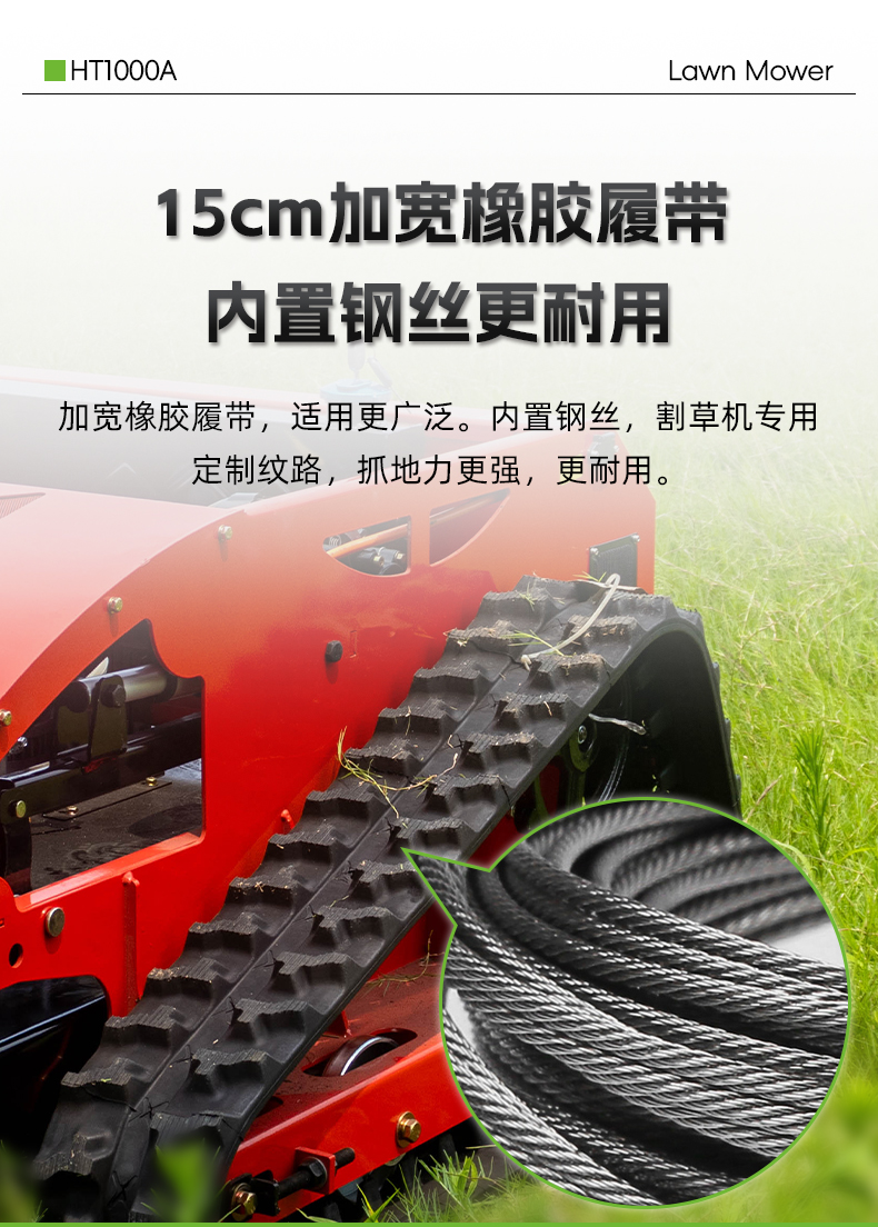 加寬橡膠履帶,適用更廣泛。內(nèi)置鋼絲,割草機(jī)專用定制紋路,抓地力更強(qiáng),更耐用。