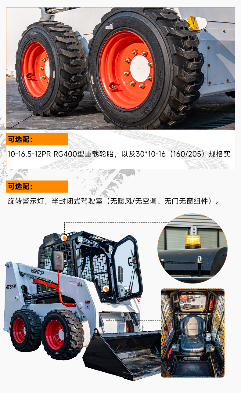 4,可選配10-16.5-12PR RG400型重載輪胎,以及30*10-16(160/205)規(guī)格實芯輪胎;旋轉警示燈,半封閉式駕駛室(無暖風/無空調、無門無窗組件)