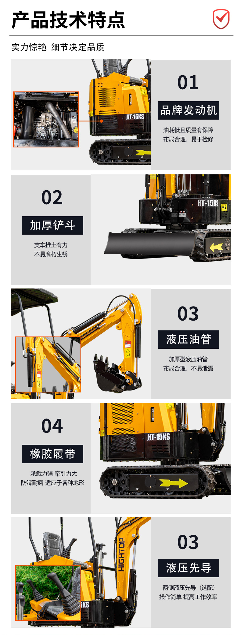 主要零部件選用可靠產(chǎn)品,發(fā)動(dòng)機(jī)為科普 KD2V80,主閥為騰飛,為整機(jī)的穩(wěn)定運(yùn)行提供了有力保障。無論是小型工程施工、庭院改造還是農(nóng)業(yè)作業(yè),HT15KS 微型挖掘機(jī)都能憑借其靈活高效的特點(diǎn),成為得力助手。