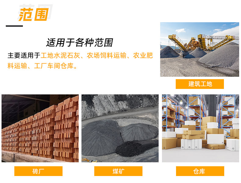 主要適用于工地水泥石灰、農(nóng)場飼料運輸、農(nóng)業(yè)肥料運輸、工廠車間倉庫。