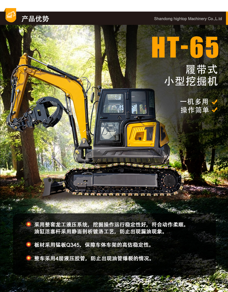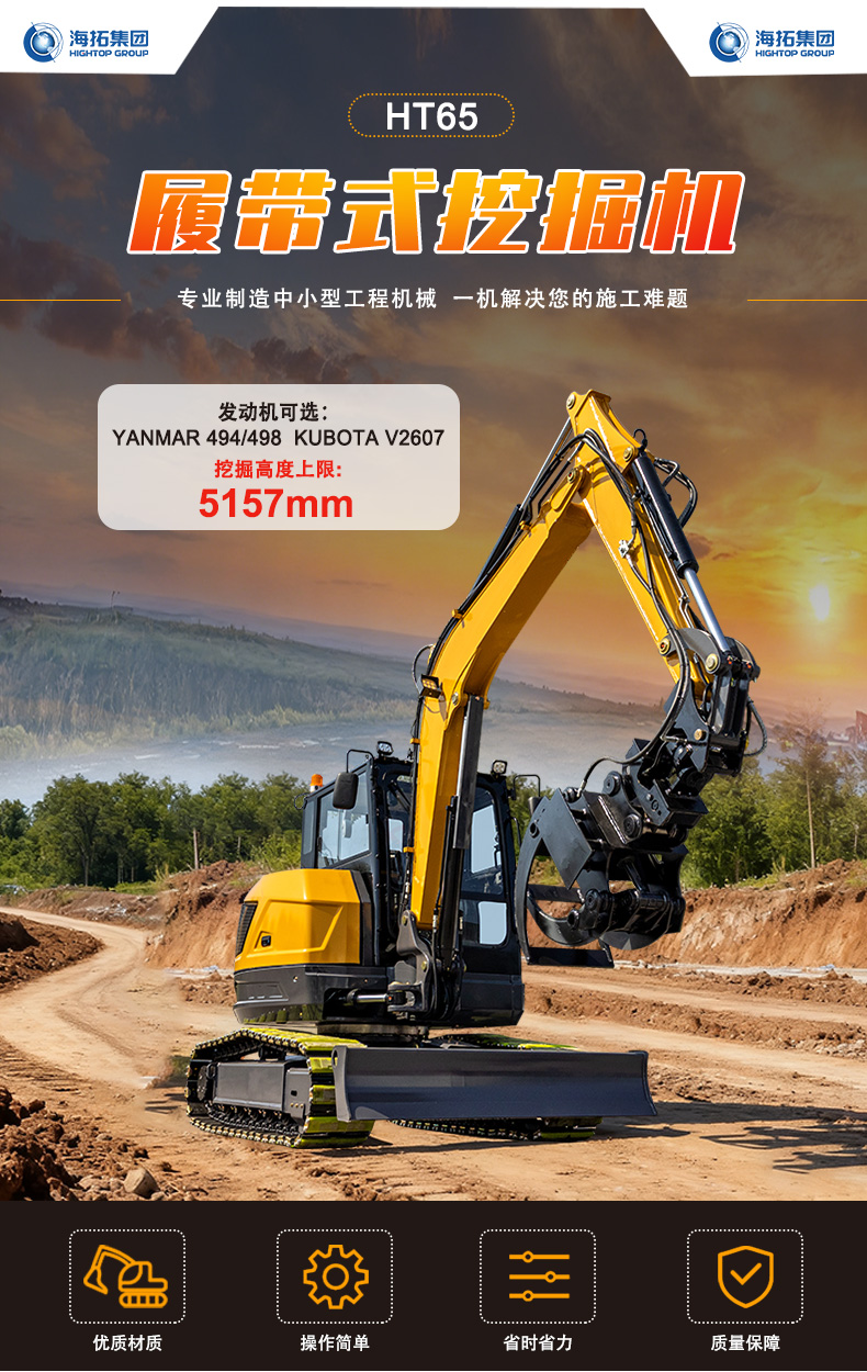 HT65履帶式挖掘機 狹窄空間作業(yè)靈活度高:總寬僅2000mm、車身寬1780mm,搭配5834mm×2570mm的緊湊整體尺寸,能輕松穿梭于城市小巷、室內裝修工地、小型廠房改造等狹窄場景,解決大型設備“進不去、轉不開”的難題。