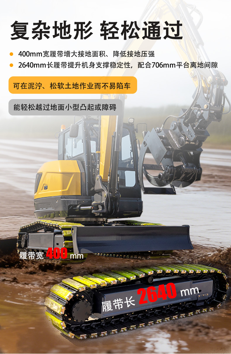 2. 復雜地形通過性強:400mm寬履帶增大接地面積、降低接地壓強,可在泥濘、松軟土地作業(yè)而不易陷車;2640mm長履帶提升機身支撐穩(wěn)定性,配合706mm平臺離地間隙,能輕松越過地面小型凸起或障礙。