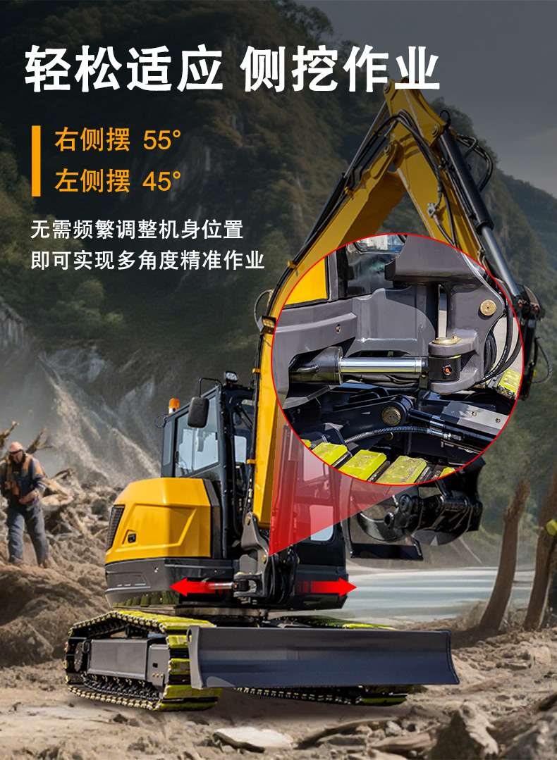 7. 側挖作業(yè)適應性突出:支持左45°、右55°側擺角度,在邊坡修整、溝渠側壁開挖等場景中,無需頻繁調整機身位置,即可實現(xiàn)多角度精準作業(yè),尤其適合市政管線鋪設時的側邊施工需求。