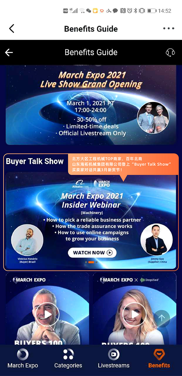 新貿(mào)節(jié)會(huì)場(chǎng)買家Befefits頁(yè)面直接進(jìn)入,半小時(shí)對(duì)話節(jié)目海拓機(jī)械代表北方商家強(qiáng)勢(shì)發(fā)聲!