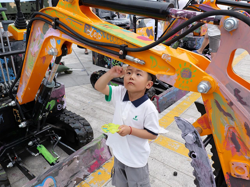 2、創(chuàng)意涂鴉賦能工業(yè),引爆話題:小藝術(shù)家們揮灑水彩,將充滿想象力的涂鴉藝術(shù)與海拓機(jī)械的硬朗工業(yè)風(fēng)完美融合,色彩斑斕的圖案跳躍在鋼鐵巨獸之上,瞬間柔化了工業(yè)產(chǎn)品的棱角,繪就了一道獨(dú)特亮麗、極具反差美的風(fēng)景線,創(chuàng)造出專屬于六一兒童節(jié)的“限量款”藝術(shù)挖機(jī)。