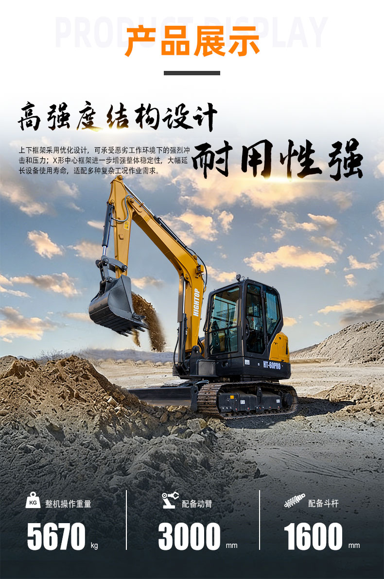 整機(jī)操作重量為5670kg,配備3000mm動(dòng)臂與1600mm斗桿,關(guān)鍵結(jié)構(gòu)部件強(qiáng)度高。上下框架采用優(yōu)化設(shè)計(jì),可承受惡劣工作環(huán)境下的強(qiáng)烈沖擊和壓力;X形中心框架進(jìn)一步增強(qiáng)整體穩(wěn)定性,大幅延長設(shè)備使用壽命,適配多種復(fù)雜工況作業(yè)需求。