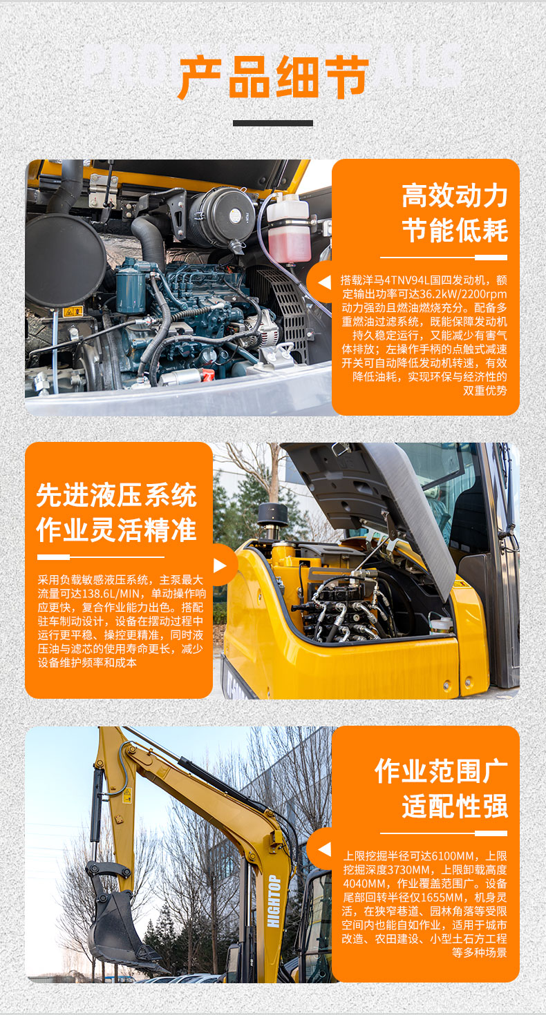 最大挖掘半徑可達(dá)6100mm,最大挖掘深度3730mm,最大卸載高度4040mm,作業(yè)覆蓋范圍廣。設(shè)備尾部回轉(zhuǎn)半徑僅1655mm,機(jī)身靈活,在狹窄巷道、園林角落等受限空間內(nèi)也能自如作業(yè),適用于城市改造、農(nóng)田建設(shè)、小型土石方工程等多種場景。