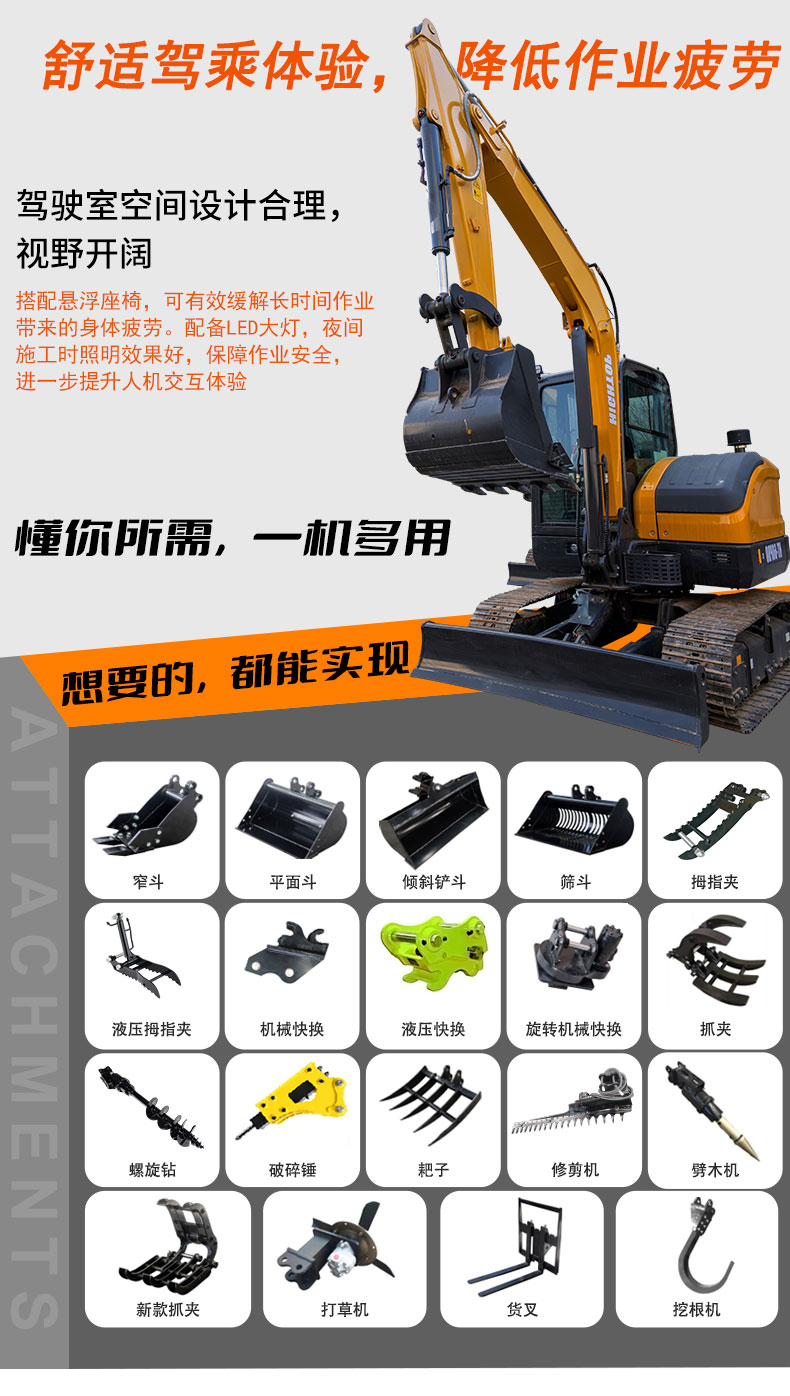 駕駛室空間設(shè)計(jì)合理,視野開闊,搭配懸浮座椅,可有效緩解長時(shí)間作業(yè)帶來的身體疲勞。配備LED大燈,夜間施工時(shí)照明效果好,保障作業(yè)安全,進(jìn)一步提升人機(jī)交互體驗(yàn)。